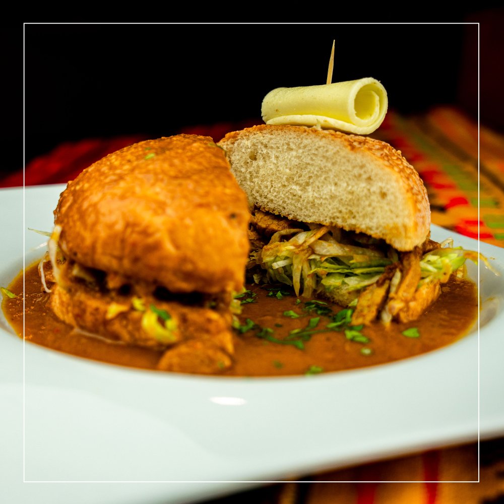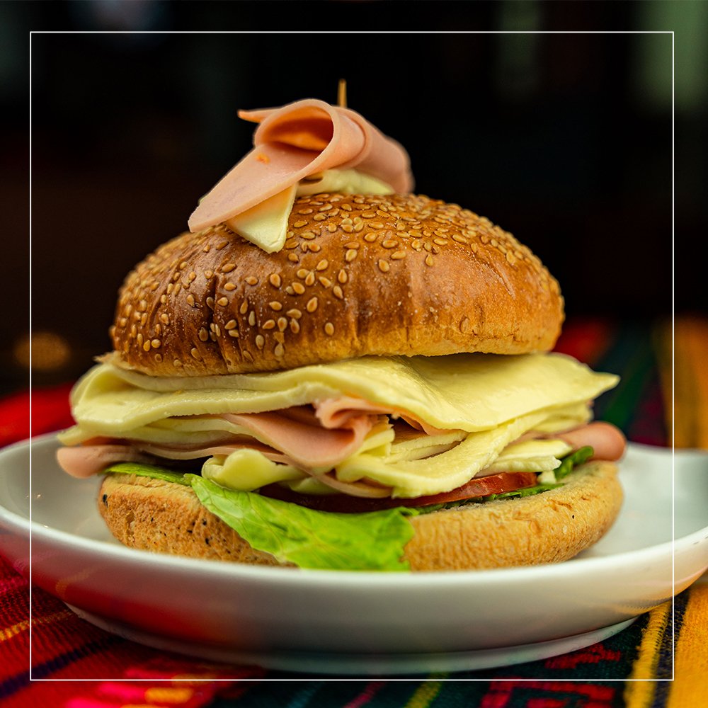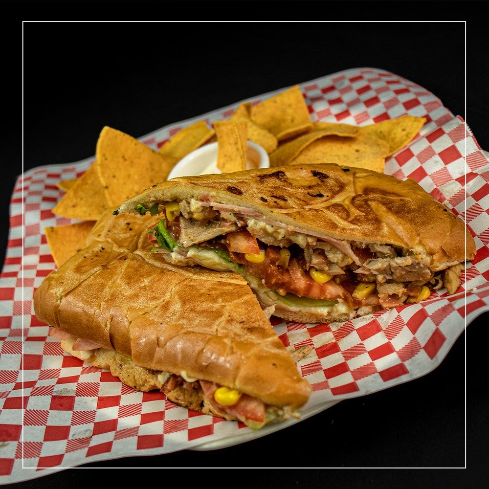 ​Tapas de pan artesanal, rellenas de sour cream, queso mozzarella, jamón ahumado, lechuga y tomate. Acompañada de totopos y salsa de ajo.