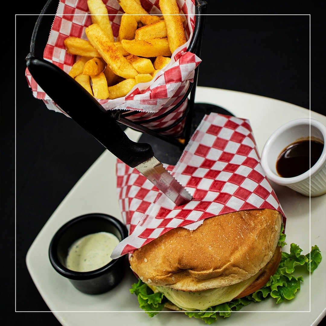 170gr de res llena de queso mozzarella asada a la parrilla, tocineta ahumada, tomate, lechuga, cebolla caramelizada, mucho queso americano, salsa de ajo y BBQ. Acompañada de papas a la francesa.