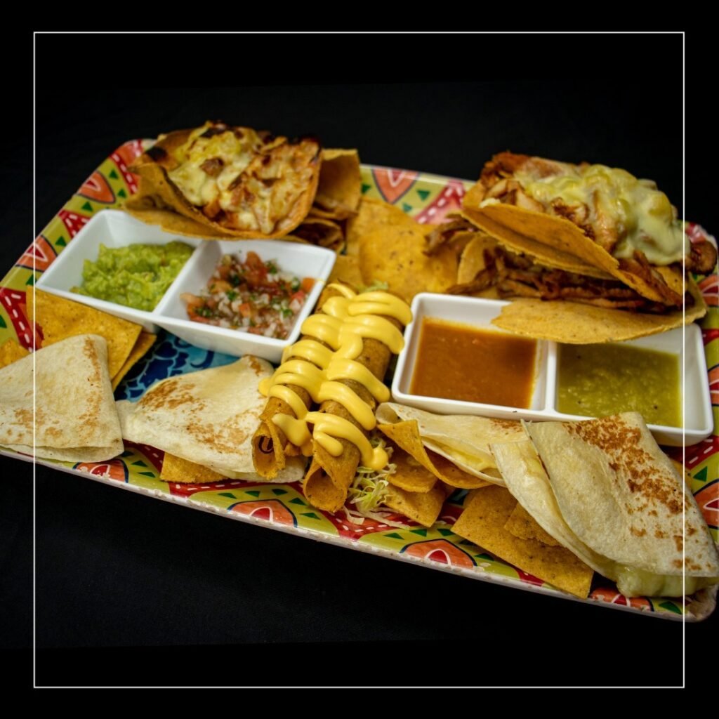 Variedad de antojos mexicanos, 4 tacos, 2 volcanes, 2 flautas y 4 quesadillas. Acompañadas de totopos y salsas mexicanas.