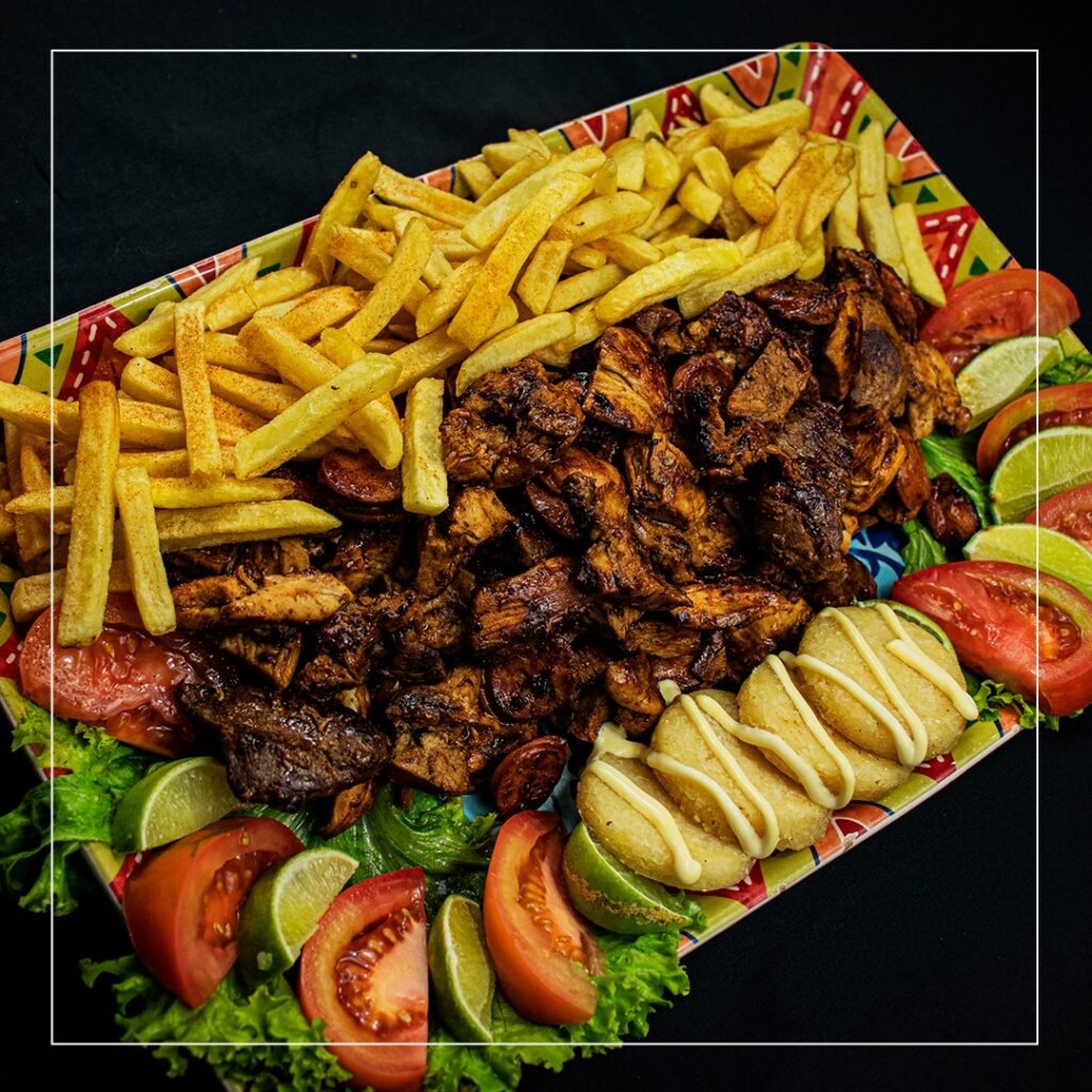 300 gr de cerdo, 300gr de pollo, 300gr de res, chorizo mexicano, papas a la francesa, arepitas crocantes de maíz. Acompañada de una línea de salsas (BBQ, guacamole, pico de gallo y chimichurri).