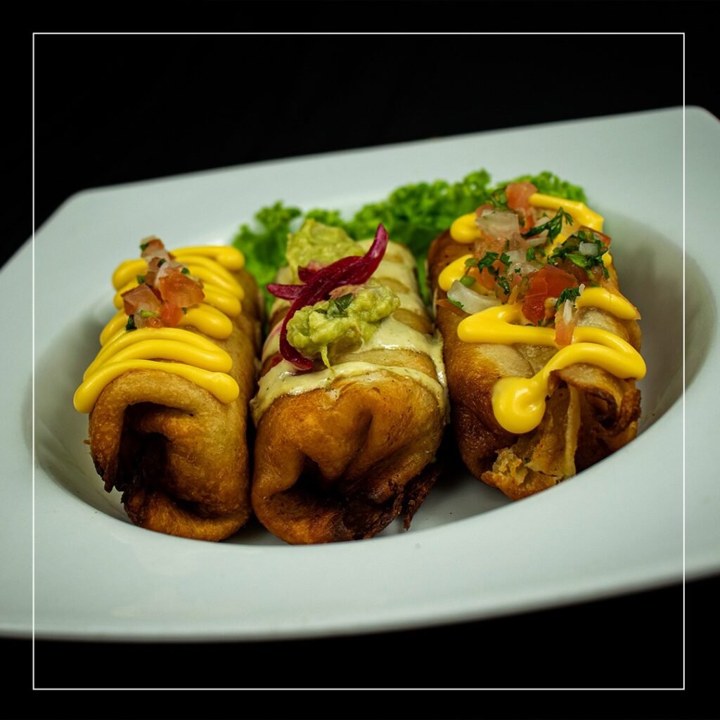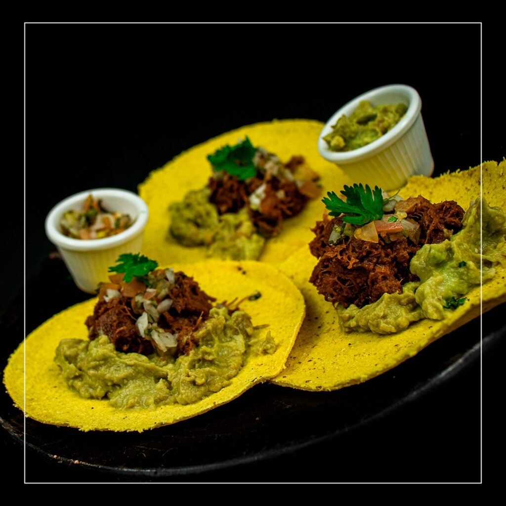 3 Tortillas crocantes de maíz rellenas con la proteína de tu preferencia (res desmechada, pollo o cerdo) cubierta con queso mozzarella, guacamole y lechuga, acompañado de dos salsas de la casa.