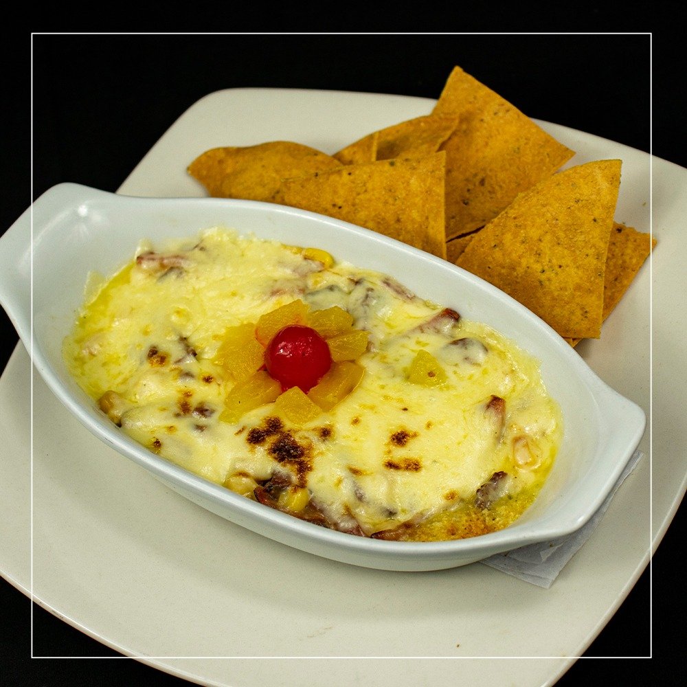 Maíz desgranado, tocineta gratinada con queso mozzarella, acompañada de piña colada y totopos.