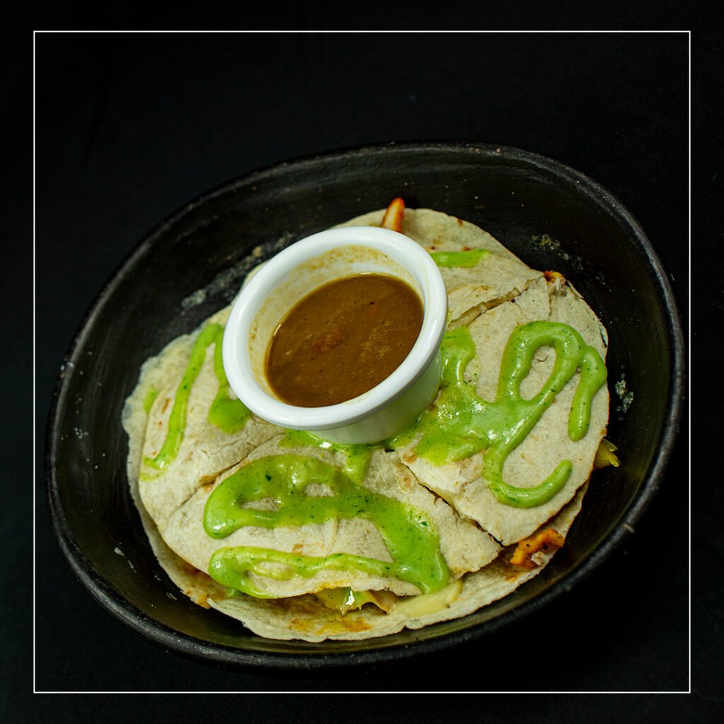 3 Tortillas crocantes de harina, rellenas de queso mozzarella, res desmechada, pollo o cerdo sobre cama de lechuga. Acompañado de guacamole, queso americano y pico de gallo.