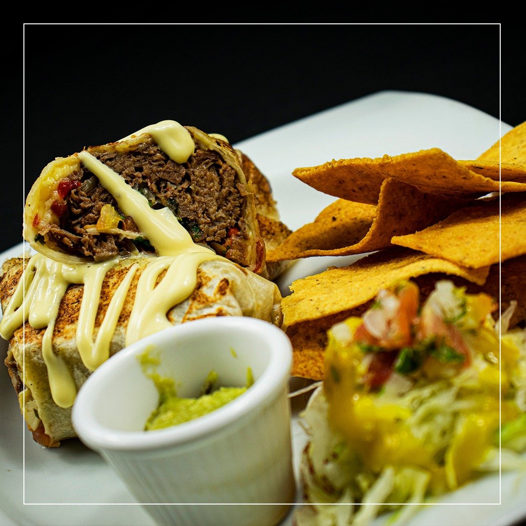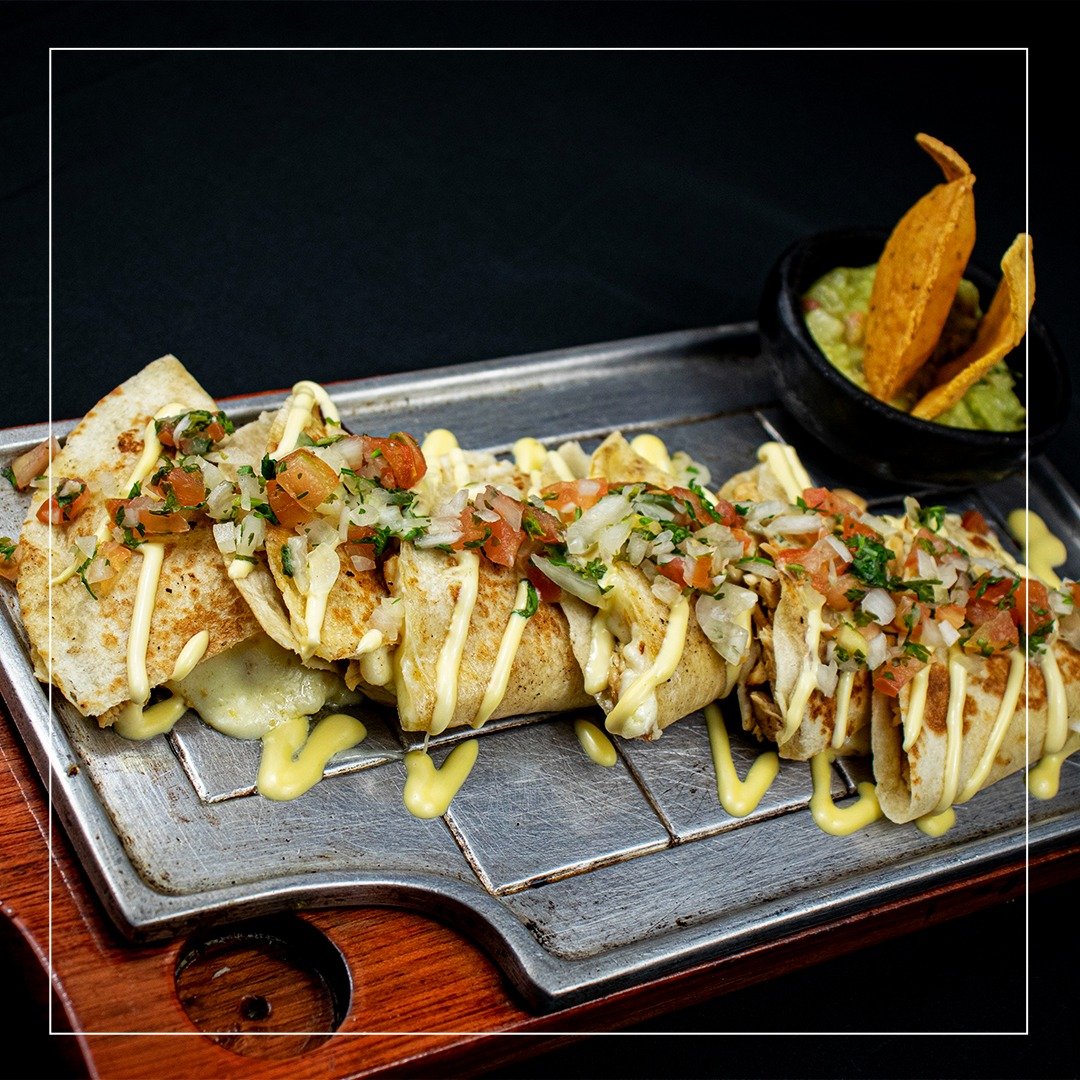 3 Tortillas de harina rellenas de queso fundido, res desmechada, pollo o cerdo a la parrilla. Acompañado de guacamole, queso americano y pico de gallo.
