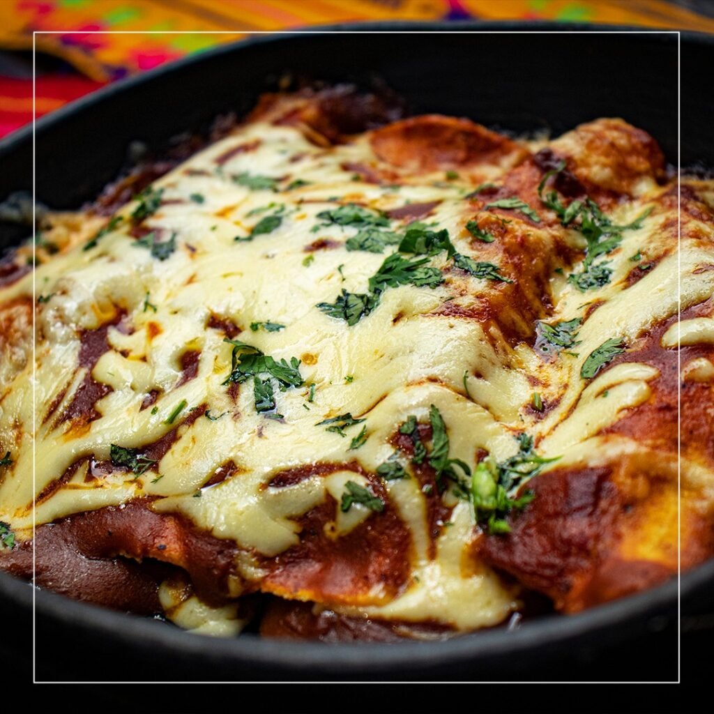 4 Tortillas de harina de maíz (artesanales) rellenas de queso, res desmechada, pollo o cerdo, bañadas con salsa chilango, gratinadas con mucho queso.