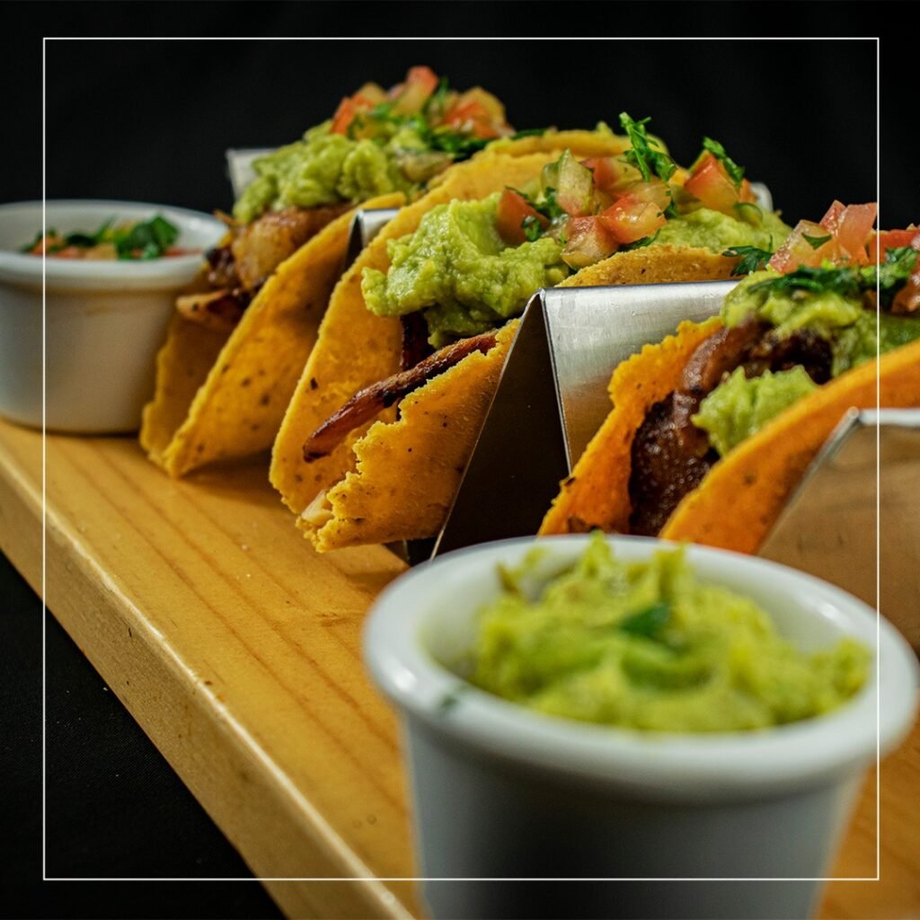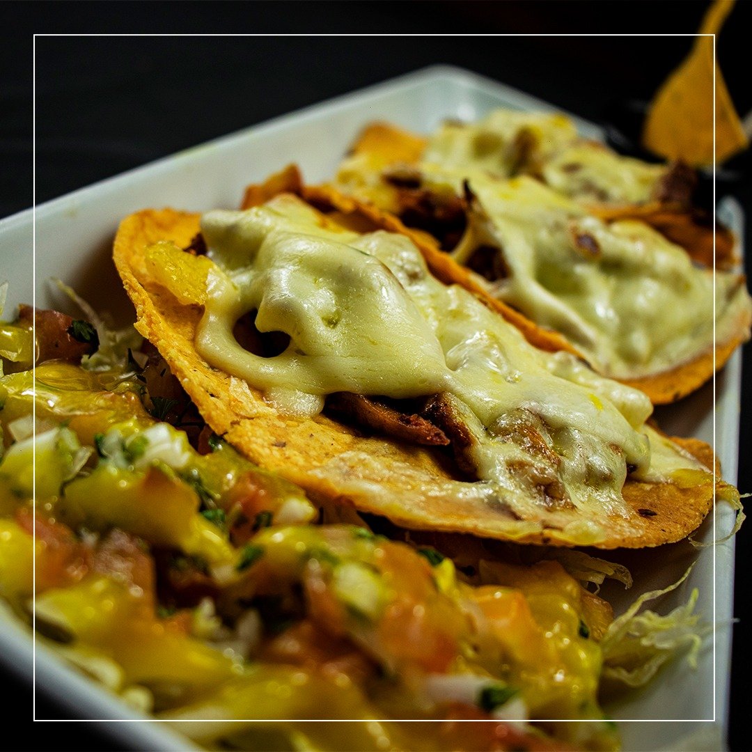 3 Tortillas crocantes de maíz rellenas con carne al pastor (cerdo adobado en salsa mexicana y piña) cubierta con queso mozzarella, guacamole y lechuga, acompañado de dos salsas de la casa.